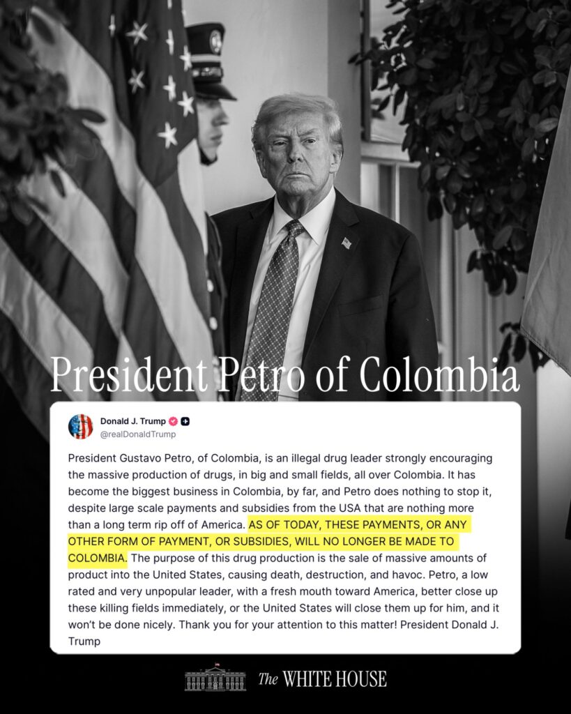 President Gustavo Petro, of Colombia, is an illegal drug leader strongly encouraging the massive production of drugs, in big and small fields, all over Colombia. It has become the biggest business in Colombia, by far, and Petro does nothing to stop it, despite large scale payments and subsidies from the USA that are nothing more than a long term rip off of America. AS OF TODAY, THESE PAYMENTS, OR ANY OTHER FORM OF PAYMENT, OR SUBSIDIES, WILL NO LONGER BE MADE TO COLOMBIA. The purpose of this drug production is the sale of massive amounts of product into the United States, causing death, destruction, and havoc. Petro, a low rated and very unpopular leader, with a fresh mouth toward America, better close up these killing fields immediately, or the United States will close them up for him, and it won’t be done nicely. Thank you for your attention to this matter! President Donald J. Trump