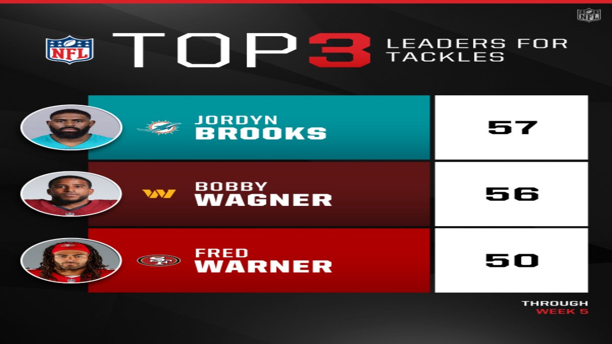 NFL Live Update : Your leaders in tackles after Week 5, United States of America NFL Top 3 Leaders for Tackles (Through Week 5) Jordyn Brooks — Miami Dolphins🟩 Total Tackles: 57🔥 Brooks leads the league with outstanding defensive performances, showing great consistency and field awareness. Bobby Wagner — Washington Commanders🟥 Total Tackles: 56🧠 A … Read more