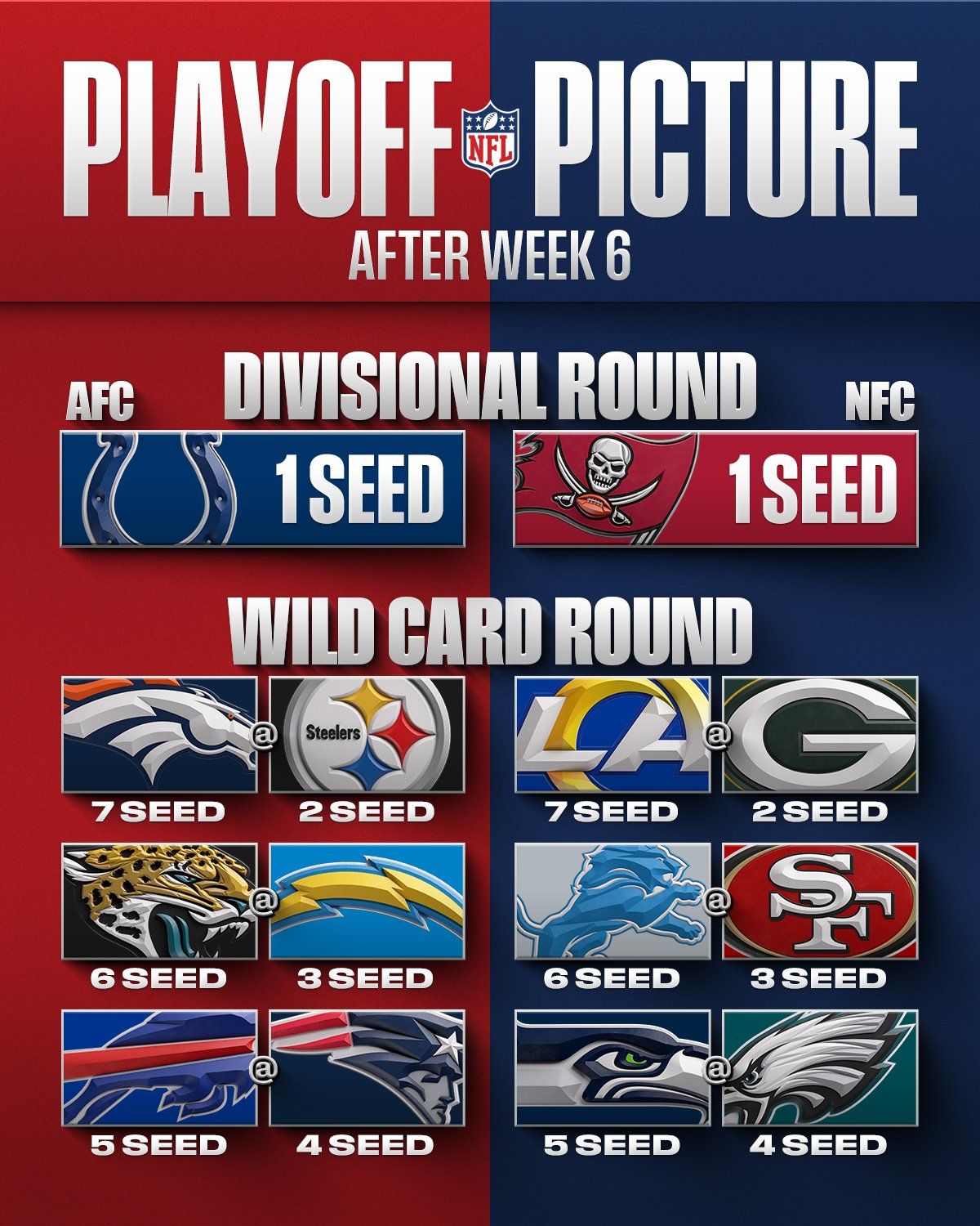 The NFL playoff picture after Week 6 The @Colts and @Buccaneers are the No. 1 seeds through Week 6