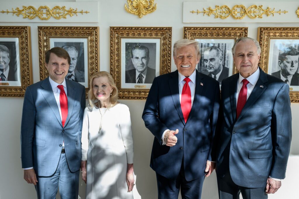 President Trump shows President Nixon’s daughter, Tricia Nixon Cox, and family the portrait of her father on the White House Colonnade.