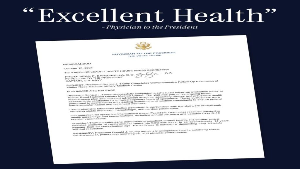 President Donald J. Trump successfully completed a scheduled follow-up evaluation today at Walter Reed National Military Medical Center. The visit was part of his ongoing health maintenance plan and included advanced imaging, laboratory testing, and preventive health assessments conducted by a multidisciplinary team of specialists. These evaluations were performed in coordination with leading academic and medical consultants to ensure optimal cardiovascular health and continued wellness.