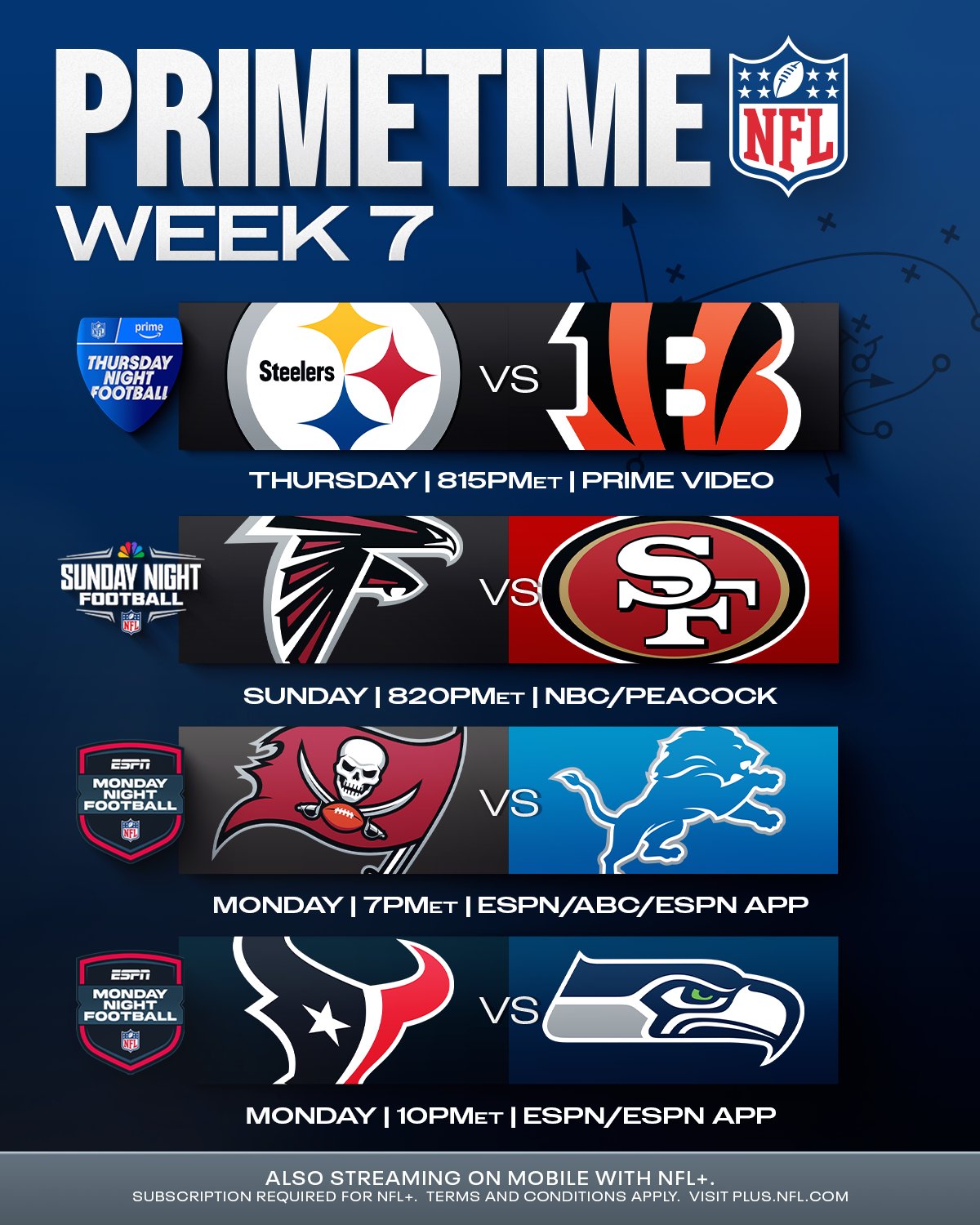 US NFL Week 7 primetime schedule, Steelers vs. Bengals, Falcons vs. 49ers, Buccaneers vs. Lions Injury Report, Live Update The primetime slate ends with a doubleheader on MNF ✨ 📱: Stream on @NFLPlus the NFL Week 7 primetime schedule as follows:
