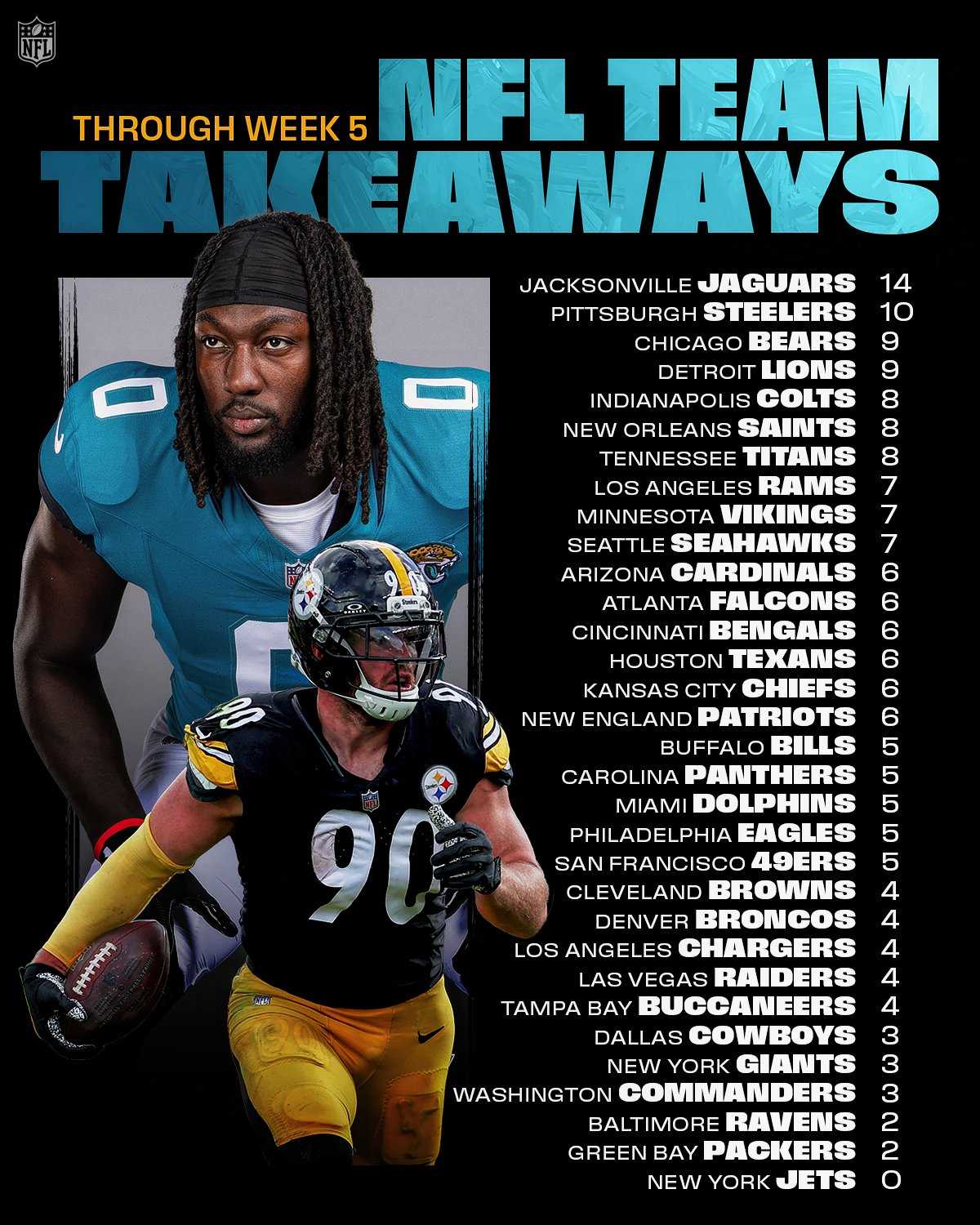 NFL Tonight Live Update : @Jaguars are known to hunt turnovers, NFL Team Takeaways United States of America NFL Tonight Live Update : @Jaguars are known to hunt turnovers @Jaguars are known to hunt turnovers “NFL Team Takeaways Through Week 5,” featuring a ranking of NFL teams based on takeaways (forced turnovers) up to Week … Read more