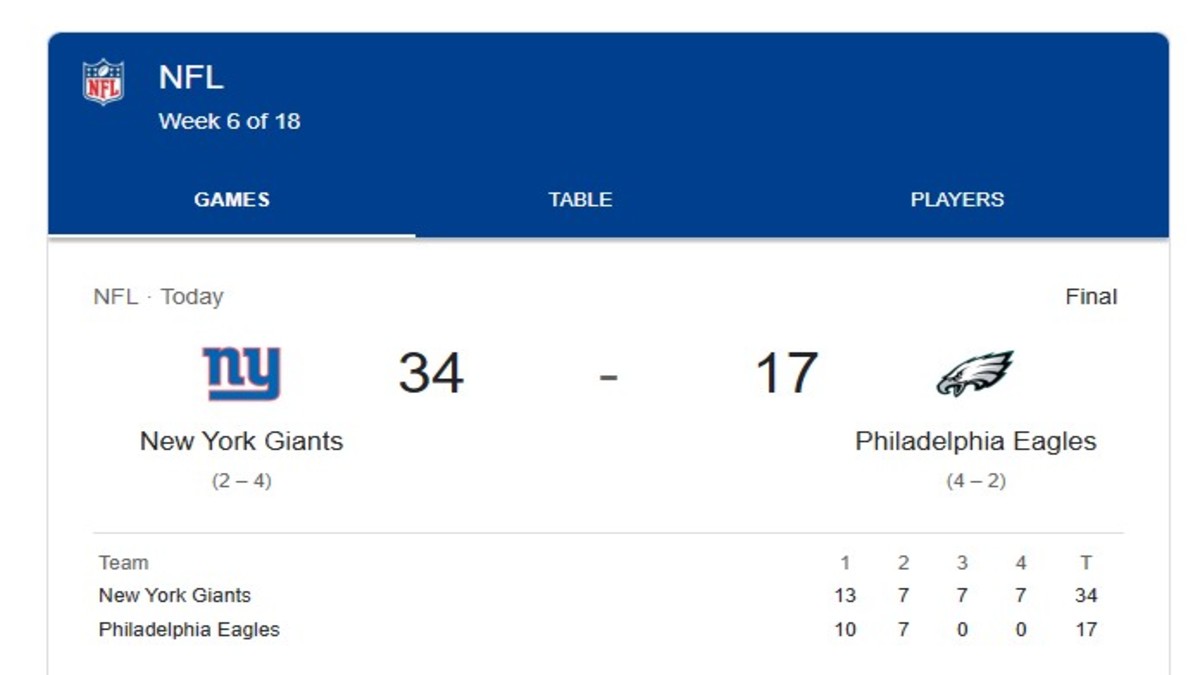 NFL Game From Week 6 of 18 between the New York Giants and the Philadelphia Eagles, a score of 34-17 against the Philadelphia Eagles. the final score of an NFL game from Week 6 of 18 between the New York Giants and the Philadelphia Eagles, played on October 10, 2025. The New York Giants won … Read more