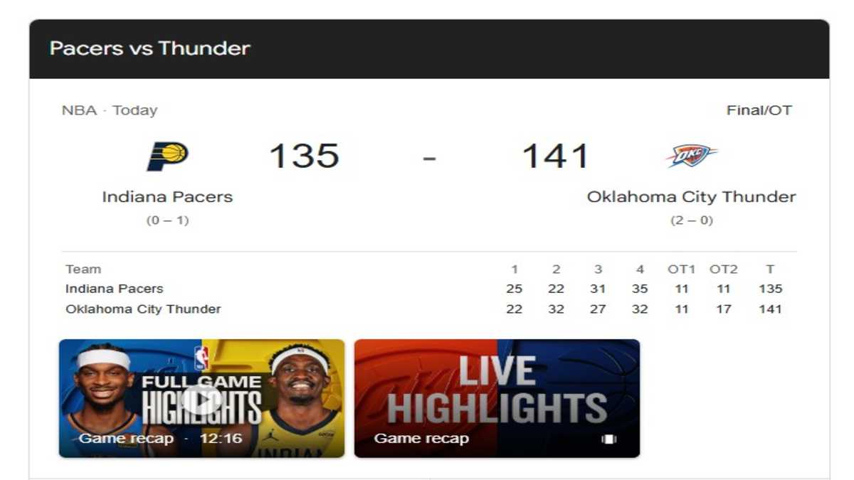 And for the second consecutive time, the Thunder defeated the Indiana Pacers 141-135 in a rematch of last season’s NBA Finals, which Oklahoma City won in a thrilling seven-game series in June.