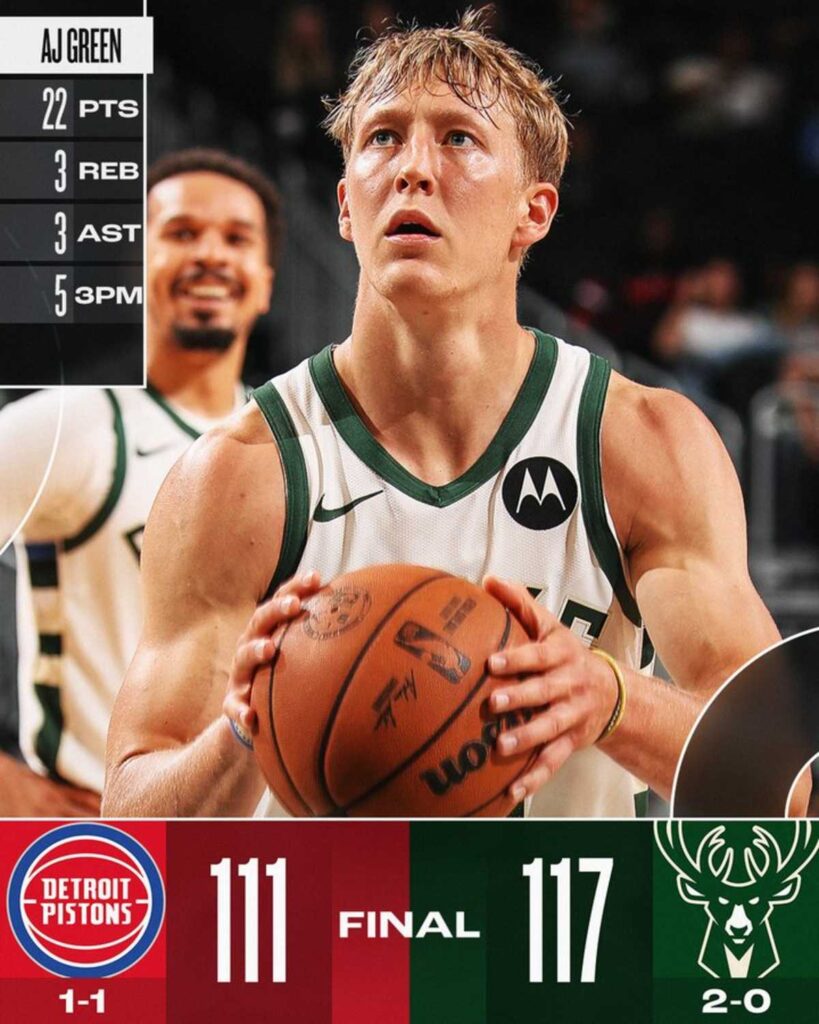 USA NBA Final Live : AJ Green’s 22 points helps the@Bucks stay undefeated in the preseason! the Detroit Pistons 117-111 in a tight preseason matchup at Fiserv Forum