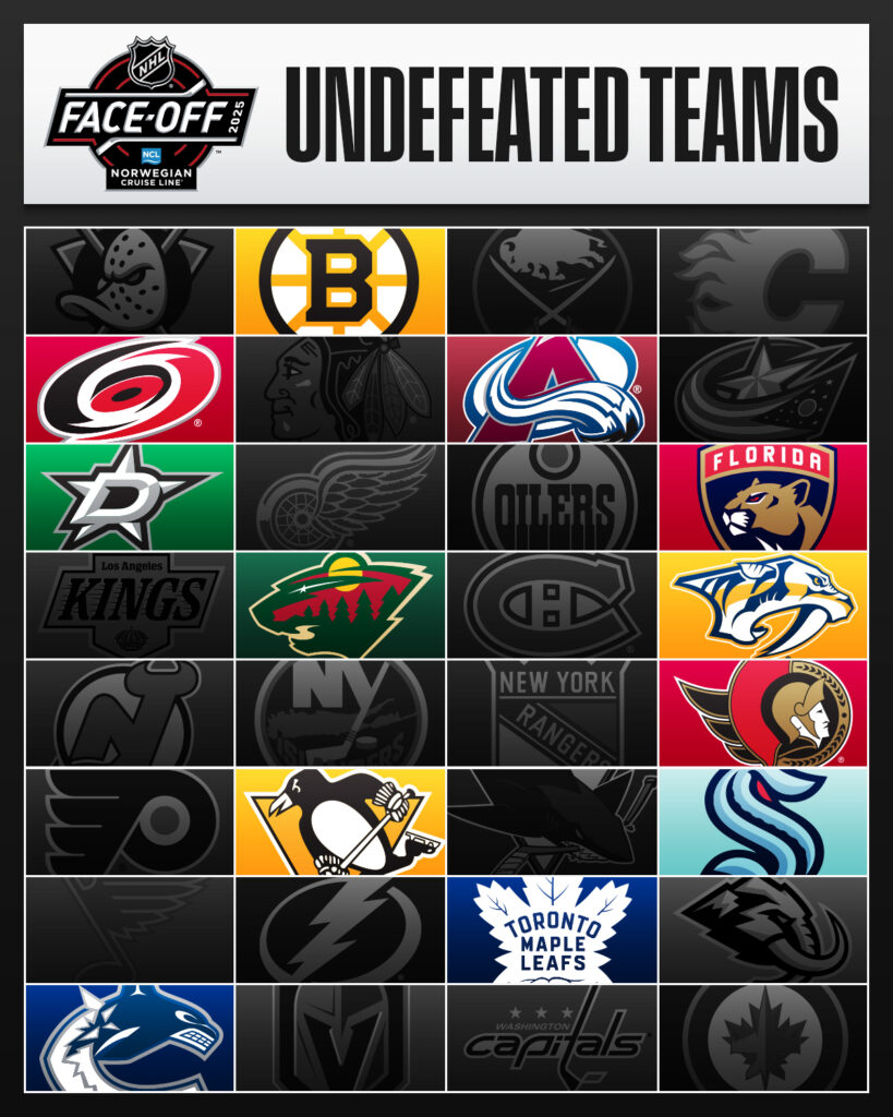 NHL Face-Off 2025″ sponsored by Norwegian Cruise Line, highlighting undefeated teams. It features logos of 20 NHL teams arranged in a grid. The teams listed are: